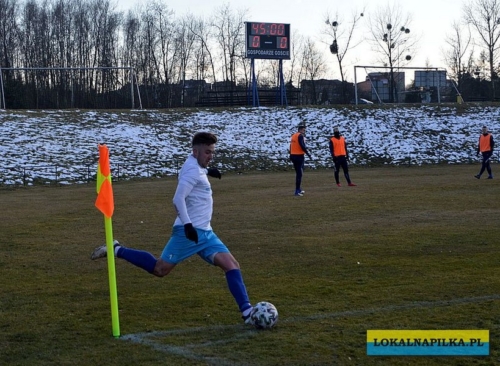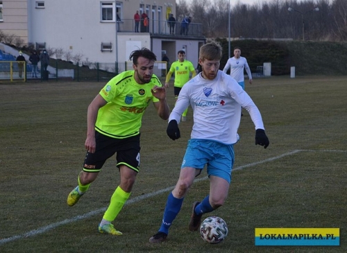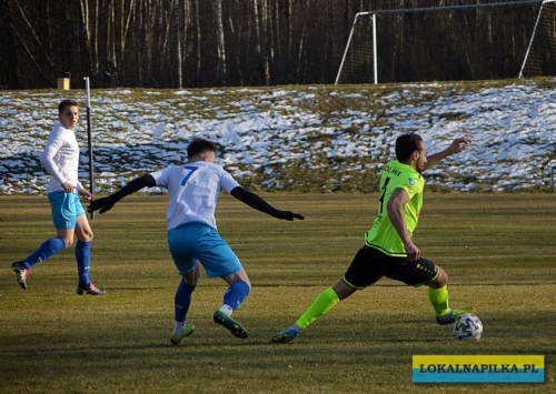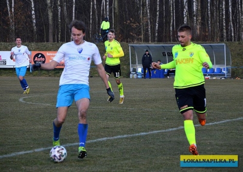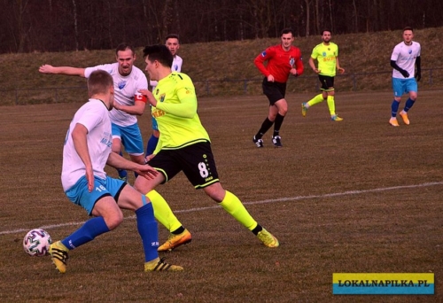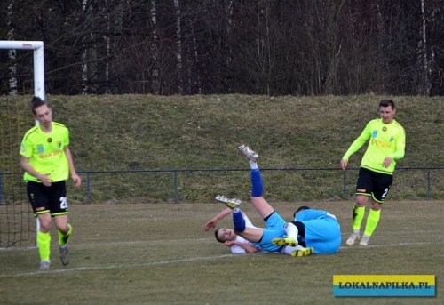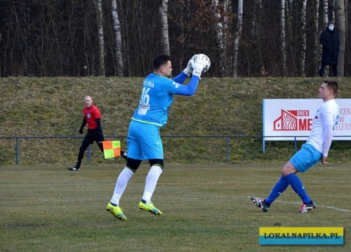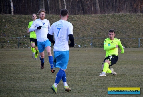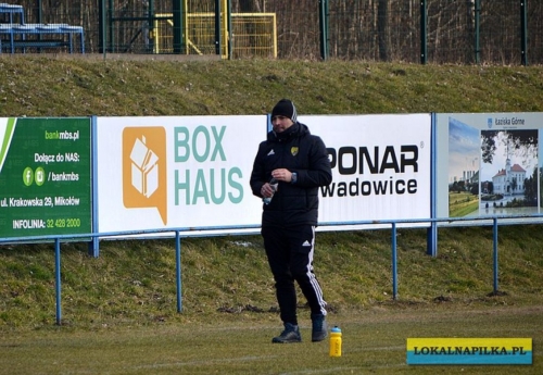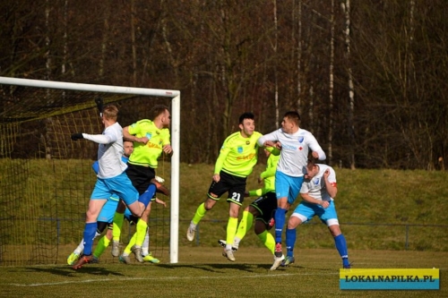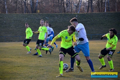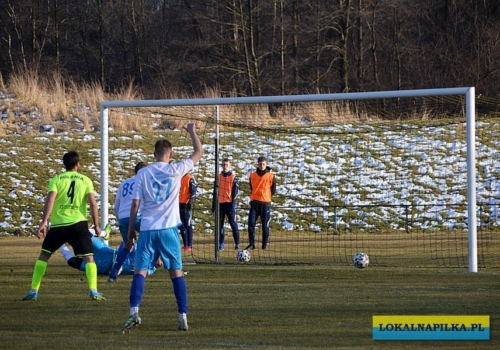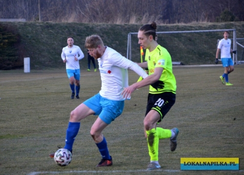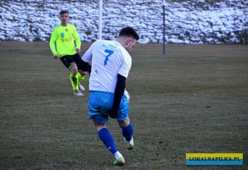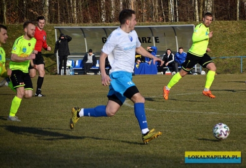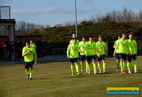 Podteksty podtekstami, ale dla obu drużyn liczył się wynik końcowy. W szeregach gospodarzy było widać rękę i pomysł szkoleniowca w postaci ustawienia z trzema defensorami i wahadłowymi. MKS po zimowych wzmocnieniach wyszedł z czwórką z tyłu i dwoma napastnikami. Lepiej w pierwszych 45 minutach wyglądali gospodarze. Zwłaszcza Fabisiak widział wiele na boisku, a najlepiej swoich kolegów, który dogrywał bardzo dokładne piłki na dobieg w bocznych strefach boiskach. Pytanie, co by się stało w 12 minucie, kiedy właśnie taka futbolówka trafiła na lewą stronę i zdawało się, że Mateusz Mazur zaraz otworzy sobie drogę do bramki. Zamiast tego padł bez kontaktu na murawę i zaczął się trzymać za tylną część uda. Efekt to wymuszona zmiana i pewnie wymuszona pauza na rekonwalescencje. Wymieniony pomocnik zdecydował się zaskoczyć Kucharskiego z dystansu, ale piłka delikatnie przeszła nad poprzeczką. W 24 minucie bardzo dobrze obsłużony w polu karnym został Hewlik, ale zamiast uderzać po długim wybrał delikatny strzał, który w żaden sposób nie zaskoczył nowego tormana Myszkowa. Kolejna ciekawa akcja miała miejsce po drugiej stronie, kiedy w kolejny pojedynek wdał się aktywny Krupa szukając Jarnota, którego strzał został zablokowany, a dobitka zza pola karnego Marka przeszła minimalnie nad. W tej połowie gospodarze domagali się jeszcze karnego, a taniec z dwoma obrońcami Badury i strzał z lobem przeszedł tuż obok.