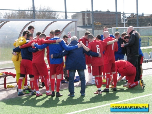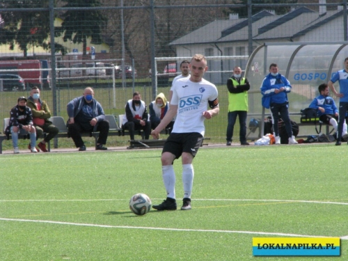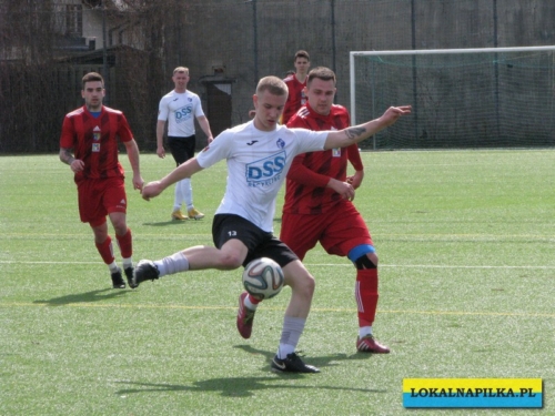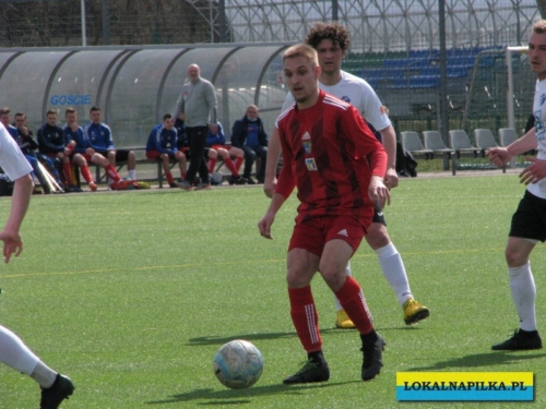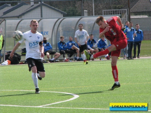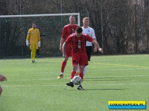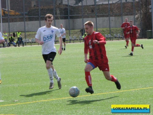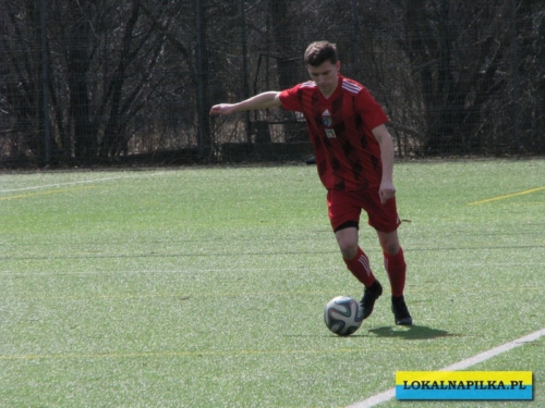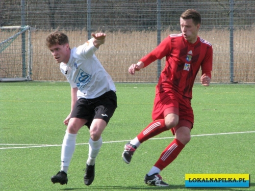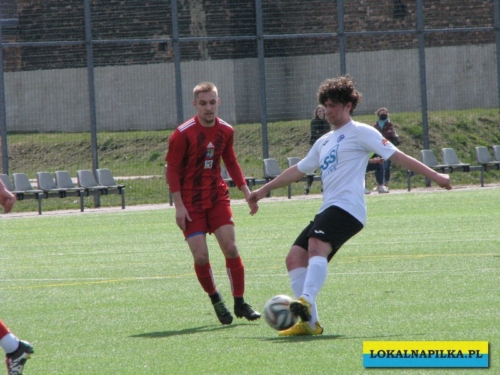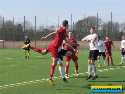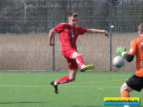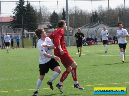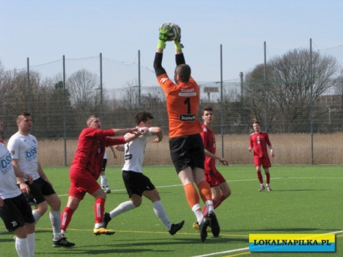 Od początku spotkania było widać lekką przewagę gości. Już w 8 minucie Maciej Wolny oddał strzał z 6 metrów, ale piłka przeszła obok słupka. W 9 minucie ostrą wrzutką w pole karne popisał się Przemysław Sawicki, ale Bartosz Nowakowski nie doszedł do tego dośrodkowania. Po tych sytuacjach ostrej reprymendy udzielił swoim zawodnikom trener gospodarzy Dariusz Klacza. Za bardzo chyba jej nie wzięli do serca zawodnicy gospodarzy, bo w 18 minucie przegrywali 0:1. Bramkę głową dla gości zdobył Dominik Wawrzyn. Dopiero ta bramka obudziła gospodarzy, którzy “zaskoczyli” i pięć minut potem po bramce Rafała Jędrzejczyka wyrównali stan meczu (23 min.). Gospodarze poszli za ciosem i w 30 minucie po strzale Jędrzejczyka piłka trafiła w poprzeczkę. Goście odpowiedzieli mocnym strzałem z ponad 20 metrów Daniela Kowalskiego, ale Aleksander Weber ładną paradą obronił ten strzał. Zasłużony remis do przerwy.
