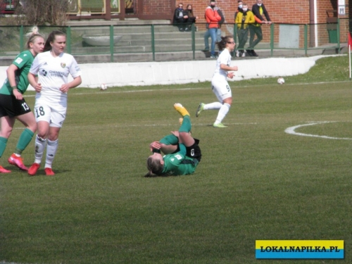 A potem zaczął się mecz, w którym grała tylko jedna drużyna. Drużyna gospodyń. Od samego początku katowiczanki przejęły inicjatywę. Efektem tej przewagi był strzał w poprzeczkę Klaudii Miłek (11. min). W 27 minucie już było 1:0. Katowiczanki ładnie wykonały rzut wolny i strzałem z daleka popisała się Zofia Buszewska. Bramkarka Śląska wyciągnęła się jak długa, ale nie sięgnęła piłki. Piłkarki trenera Zająca poszły za ciosem i chwilę później prowadziły już 2:0. Swoją drugą bramkę, po strzale z rzutu karnego zdobyła Buszewska (31. min). Piłkarkom GieKSy było mało i w 44 minucie Klaudia Miłek strzałem zdobyła trzecią bramkę i na przerwę do szatni w lepszych humorach schodziły katowiczanki.