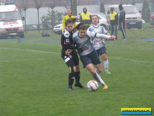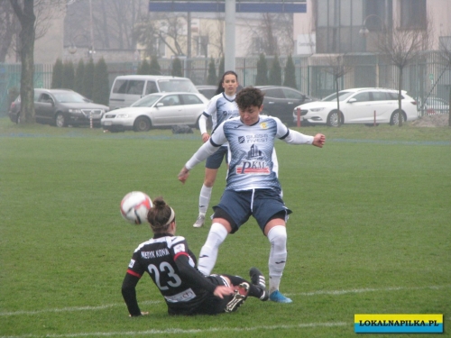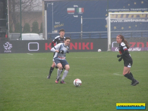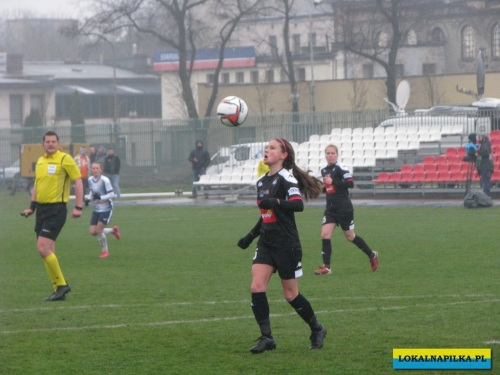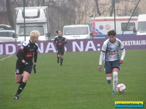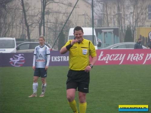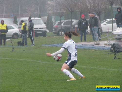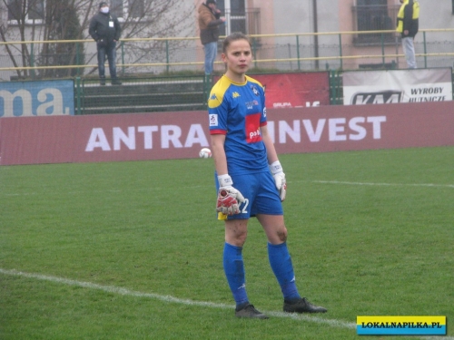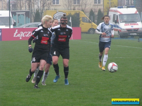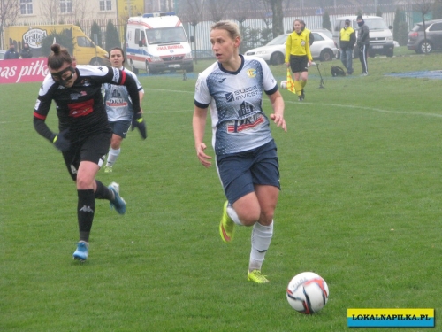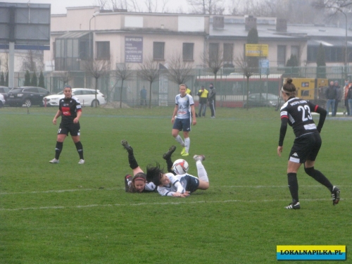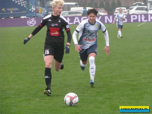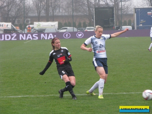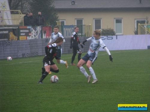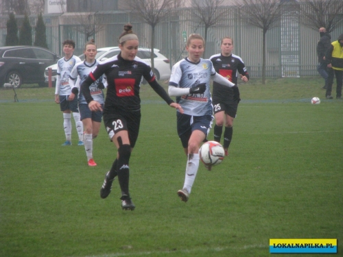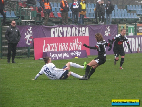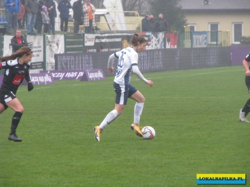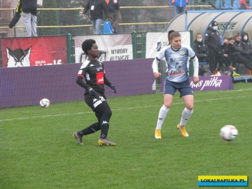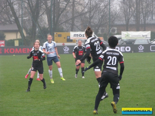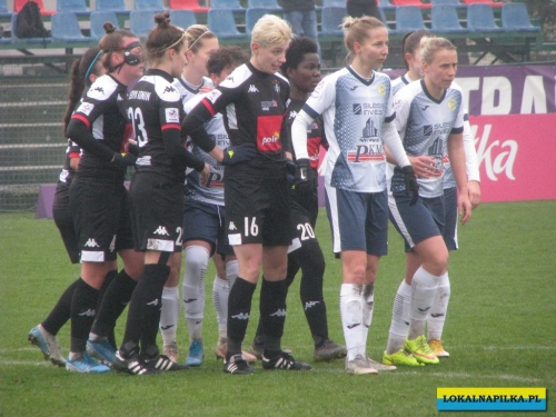 W pierwszej połowie nie oglądaliśmy bramek, ale kilka sytuacji podbramkowych widzieliśmy. W 3 minucie Martyna Wiankowska wywalczyła rzut rożny. Po centrze w pole karne do piłki wyskoczyła Agnieszka Jędrzejewicz i uderzyła głową, ale słupek asekurowała Ernestina Abambila i spokojnie przejęła piłkę. W 10 minucie Jędrzejewicz oddała strzał, ale Oliwia Szymczak obroniła. W 13 minucie piłkarki Czarnych przejęły piłkę i w znakomitej sytuacji znalazła się Veronika Slukova, ale fatalnie spudłowała. W 17 minucie ponownie Jędrzejczyk uderzała, ale piłka poszybowała nad poprzeczką. W drugiej części pierwszej połowy do głosu doszły piłkarki Medyka i w 27 minucie na ładny strzał z daleka zdecydowała się Alicia Tamburro, piłka minimalnie minęła spojenie słupka z poprzeczką. W 44 minucie sędzia spotkania Tomasz Musiał zamiast rzutu karnego pokazał żółtą kartkę Slukovej za próbę wymuszenia rzutu karnego. Zasłużony remis do przerwy.