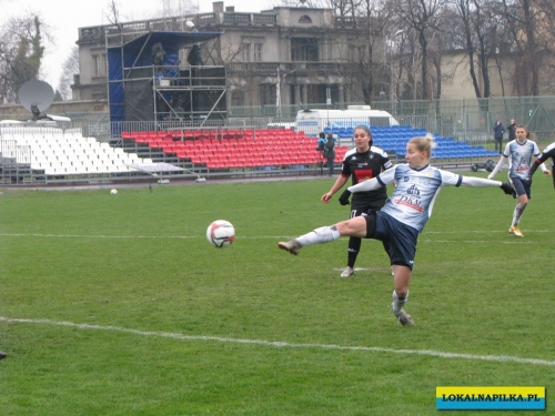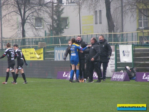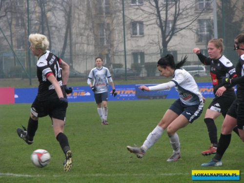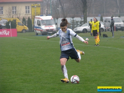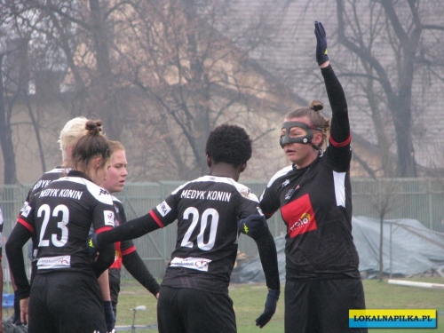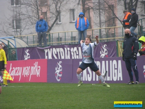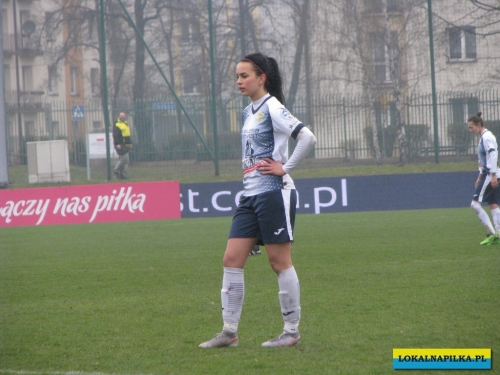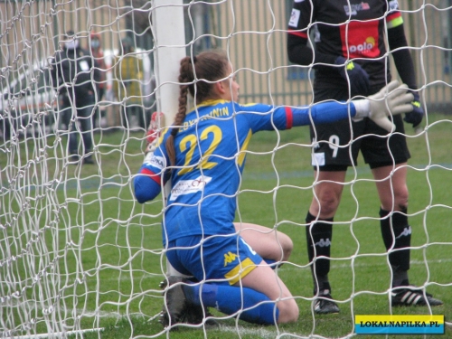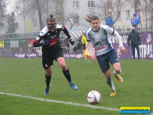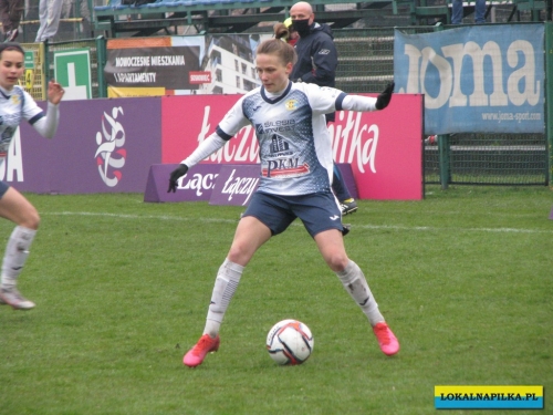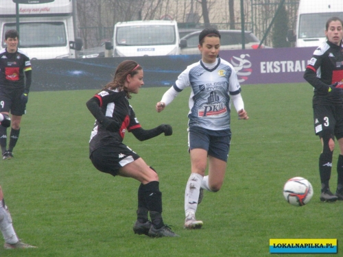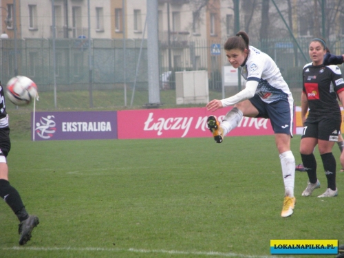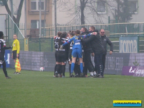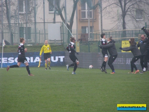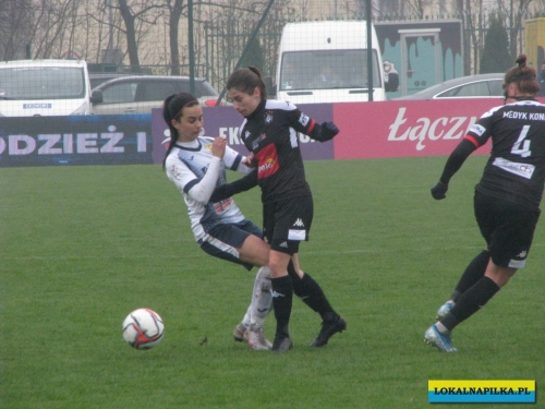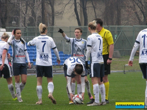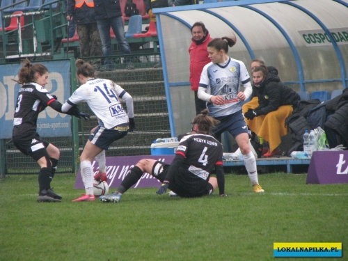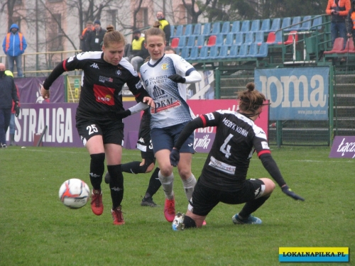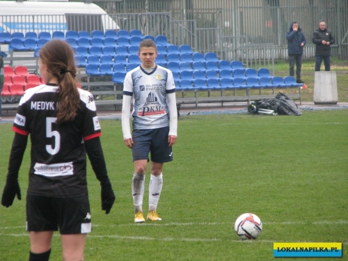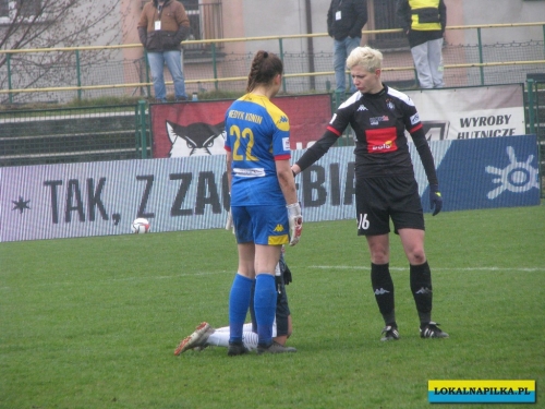 W pierwszej połowie nie oglądaliśmy bramek, ale kilka sytuacji podbramkowych widzieliśmy. W 3 minucie Martyna Wiankowska wywalczyła rzut rożny. Po centrze w pole karne do piłki wyskoczyła Agnieszka Jędrzejewicz i uderzyła głową, ale słupek asekurowała Ernestina Abambila i spokojnie przejęła piłkę. W 10 minucie Jędrzejewicz oddała strzał, ale Oliwia Szymczak obroniła. W 13 minucie piłkarki Czarnych przejęły piłkę i w znakomitej sytuacji znalazła się Veronika Slukova, ale fatalnie spudłowała. W 17 minucie ponownie Jędrzejczyk uderzała, ale piłka poszybowała nad poprzeczką. W drugiej części pierwszej połowy do głosu doszły piłkarki Medyka i w 27 minucie na ładny strzał z daleka zdecydowała się Alicia Tamburro, piłka minimalnie minęła spojenie słupka z poprzeczką. W 44 minucie sędzia spotkania Tomasz Musiał zamiast rzutu karnego pokazał żółtą kartkę Slukovej za próbę wymuszenia rzutu karnego. Zasłużony remis do przerwy.