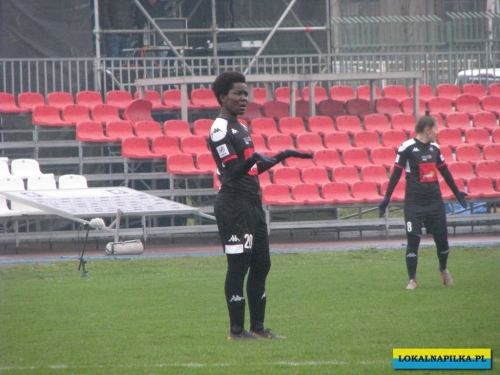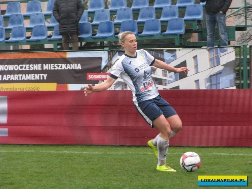 W drugiej połowie zobaczyliśmy już to, co kibice lubią najbardziej, czyli bramki… Pierwsza padła już w 51 minucie. Gospodynie źle rozegrały rzut rożny i straciły piłkę. Piłkarki Medyka przeprowadziły wzorową kontrę. Piłkę na skrzydło dostała Julia Maskiewicz i wrzuciła ją w pole karne, tam znakomitym wolejem popisała się Natalia Chudzik i zrobiło się 0:1 i zrobił się mecz…W 53 minucie powinien być chyba rzut karny dla gospodyń, bo Maskiewicz faulowała Andree Horvathovą jak nie w polu karnym, to na pewno na linii pola karnego, ale sędzia Musiał podyktował “tylko” rzut wolny, który zmarnowała Wiankowska, bo piłka po jej strzale trafiła w mur i wyszła na aut. Do rzutu rożnego podeszłą Dorota Hałatek i po jej wrzutce zakotłowało się, tak, że po strzale Slukovej Abambila wybiła piłkę z linii bramkowej. Chwilę potem stoickim spokojem popisała się dobrze tego dnia broniąca Szymczak, która złapała wysoko piłkę na linii bramkowej i nie dała się przepchnąć piłkarkom Czarnych. Ten moment przewagi Czarnych został nagrodzony bramką. W 60 minucie Sandra Sałata fauluje Jędrzejewicz i tym razem sędzia Musiał dyktuje rzut karny, który na bramkę zamienia Wiankowska. W odpowiedzi w 65 minucie Alexis Mugica popisała się ładną główką, ale piłka przeszła obok bramki. To był sygnał, że Medyk się nie zadowoli remisem. I w tej samej minucie Anna Gawrońska popisała się kapitalnym lobem – w towarzystwie trzech sosnowiczanek – nad Anną Szymańską wyprowadzając swój zespół na prowadzenie. W 75 minucie Czarne wykonywały rzut wolny, ale piłka po strzale Horvathovej poszybowała nad poprzeczką. W 78 minucie Wiankowska z 5 metrów popisała się wolejem, niestety obok dla sosnowiczanek obok słupka. W odpowiedzi w 84 minucie Chudzik uderzyła minimalnie nad poprzeczką. W 88 minucie mogła wyrównać Jędrzejewska, ale piłkę po jej strzale wybiła dobrze ustawiona Maskiewicz. Co nie udało się Czarnym, udało się w 90 minucie Medykowi. Znów strata sosnowiczanek po swoim rogu. Piłkę przejęła Daria Nowak i założyła “siatkę” Klaudii Tobiczek, następnie podała do Michalopoulou, ta przebiegła z piłką w towarzystwie Julii Wycisk z 30 metrów i bez problemów skierowała piłkę obok wybiegającej Szymańskiej. Tym sposobem pierwsza porażka w tym sezonie Czarnych stała się faktem, ale patrząc na historię meczów sosnowiczanek z Medykiem u siebie można rzec, że tradycja nie wygrania z Nimi została podtrzymana…