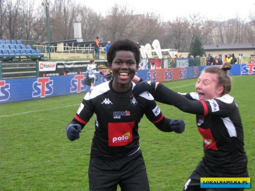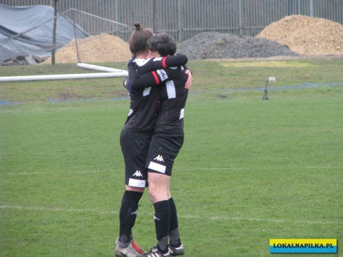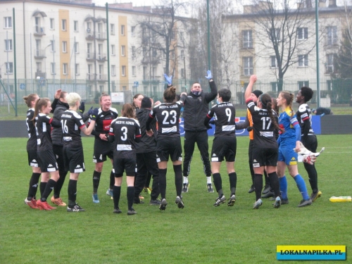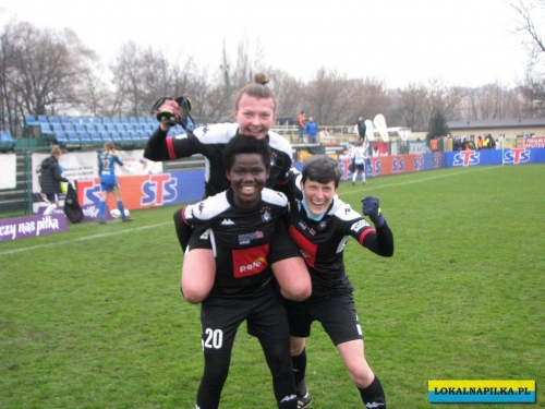 W drugiej połowie zobaczyliśmy już to, co kibice lubią najbardziej, czyli bramki… Pierwsza padła już w 51 minucie. Gospodynie źle rozegrały rzut rożny i straciły piłkę. Piłkarki Medyka przeprowadziły wzorową kontrę. Piłkę na skrzydło dostała Julia Maskiewicz i wrzuciła ją w pole karne, tam znakomitym wolejem popisała się Natalia Chudzik i zrobiło się 0:1 i zrobił się mecz…W 53 minucie powinien być chyba rzut karny dla gospodyń, bo Maskiewicz faulowała Andree Horvathovą jak nie w polu karnym, to na pewno na linii pola karnego, ale sędzia Musiał podyktował “tylko” rzut wolny, który zmarnowała Wiankowska, bo piłka po jej strzale trafiła w mur i wyszła na aut. Do rzutu rożnego podeszłą Dorota Hałatek i po jej wrzutce zakotłowało się, tak, że po strzale Slukovej Abambila wybiła piłkę z linii bramkowej. Chwilę potem stoickim spokojem popisała się dobrze tego dnia broniąca Szymczak, która złapała wysoko piłkę na linii bramkowej i nie dała się przepchnąć piłkarkom Czarnych. Ten moment przewagi Czarnych został nagrodzony bramką. W 60 minucie Sandra Sałata fauluje Jędrzejewicz i tym razem sędzia Musiał dyktuje rzut karny, który na bramkę zamienia Wiankowska. W odpowiedzi w 65 minucie Alexis Mugica popisała się ładną główką, ale piłka przeszła obok bramki. To był sygnał, że Medyk się nie zadowoli remisem. I w tej samej minucie Anna Gawrońska popisała się kapitalnym lobem – w towarzystwie trzech sosnowiczanek – nad Anną Szymańską wyprowadzając swój zespół na prowadzenie. W 75 minucie Czarne wykonywały rzut wolny, ale piłka po strzale Horvathovej poszybowała nad poprzeczką. W 78 minucie Wiankowska z 5 metrów popisała się wolejem, niestety obok dla sosnowiczanek obok słupka. W odpowiedzi w 84 minucie Chudzik uderzyła minimalnie nad poprzeczką. W 88 minucie mogła wyrównać Jędrzejewska, ale piłkę po jej strzale wybiła dobrze ustawiona Maskiewicz. Co nie udało się Czarnym, udało się w 90 minucie Medykowi. Znów strata sosnowiczanek po swoim rogu. Piłkę przejęła Daria Nowak i założyła “siatkę” Klaudii Tobiczek, następnie podała do Michalopoulou, ta przebiegła z piłką w towarzystwie Julii Wycisk z 30 metrów i bez problemów skierowała piłkę obok wybiegającej Szymańskiej. Tym sposobem pierwsza porażka w tym sezonie Czarnych stała się faktem, ale patrząc na historię meczów sosnowiczanek z Medykiem u siebie można rzec, że tradycja nie wygrania z Nimi została podtrzymana…